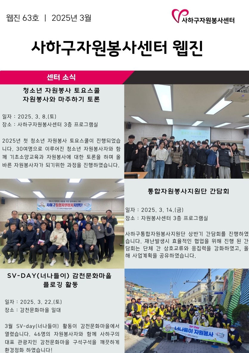 사하구자원봉사센터 2025년 3월 웹진 63호 페이지 정보 작성자 최고관리자 댓글 0건 조회 1,060회 작성일 25-04-03 13:15 목록 본문 이전글사하구자원봉사센터 2025년 4월 웹진 64호 25.05.09 다음글사하구자원봉사센터 2025년 2월 웹진 62호 25.03.06 댓글 0 댓글목록 등록된 댓글이 없습니다.